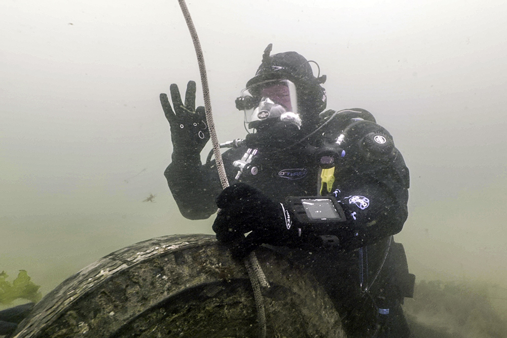 Ross Kemp recovering a tyre for 1000 Tyres Project, Cawsand Bay, August 2021