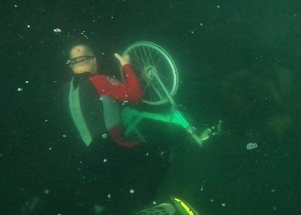 Recovering a Beryl Bike from the sea off the Hoe, Plymouth Sound, August 2024