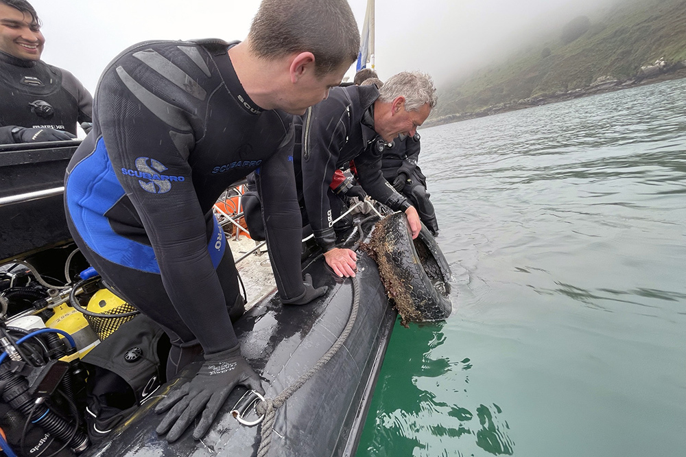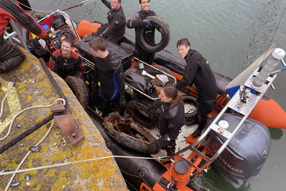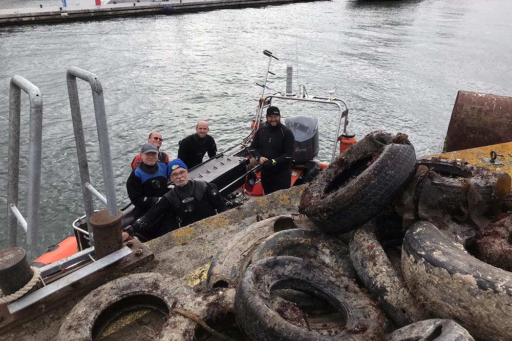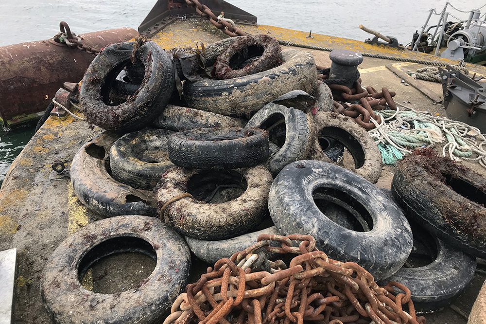 This was the first, experimental underwater clean up using volunteer divers from the Plymouth Sound branch of the British Sub-Aqua Club. The divers recovered 49 tyres from locations found previously by side scan sonar survey, then took them back to the barge for temporary storage.