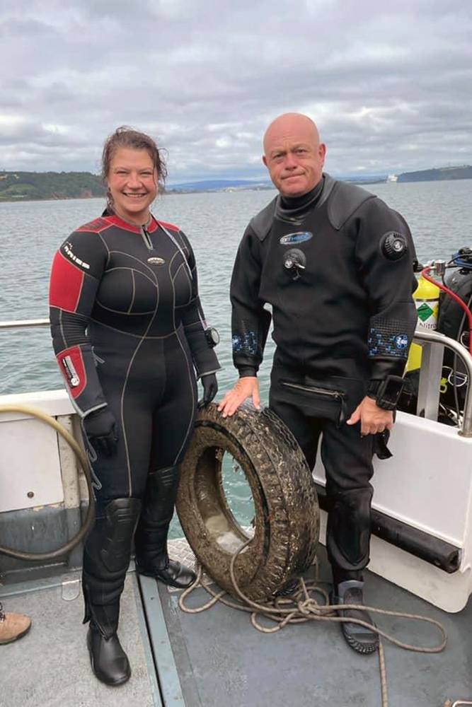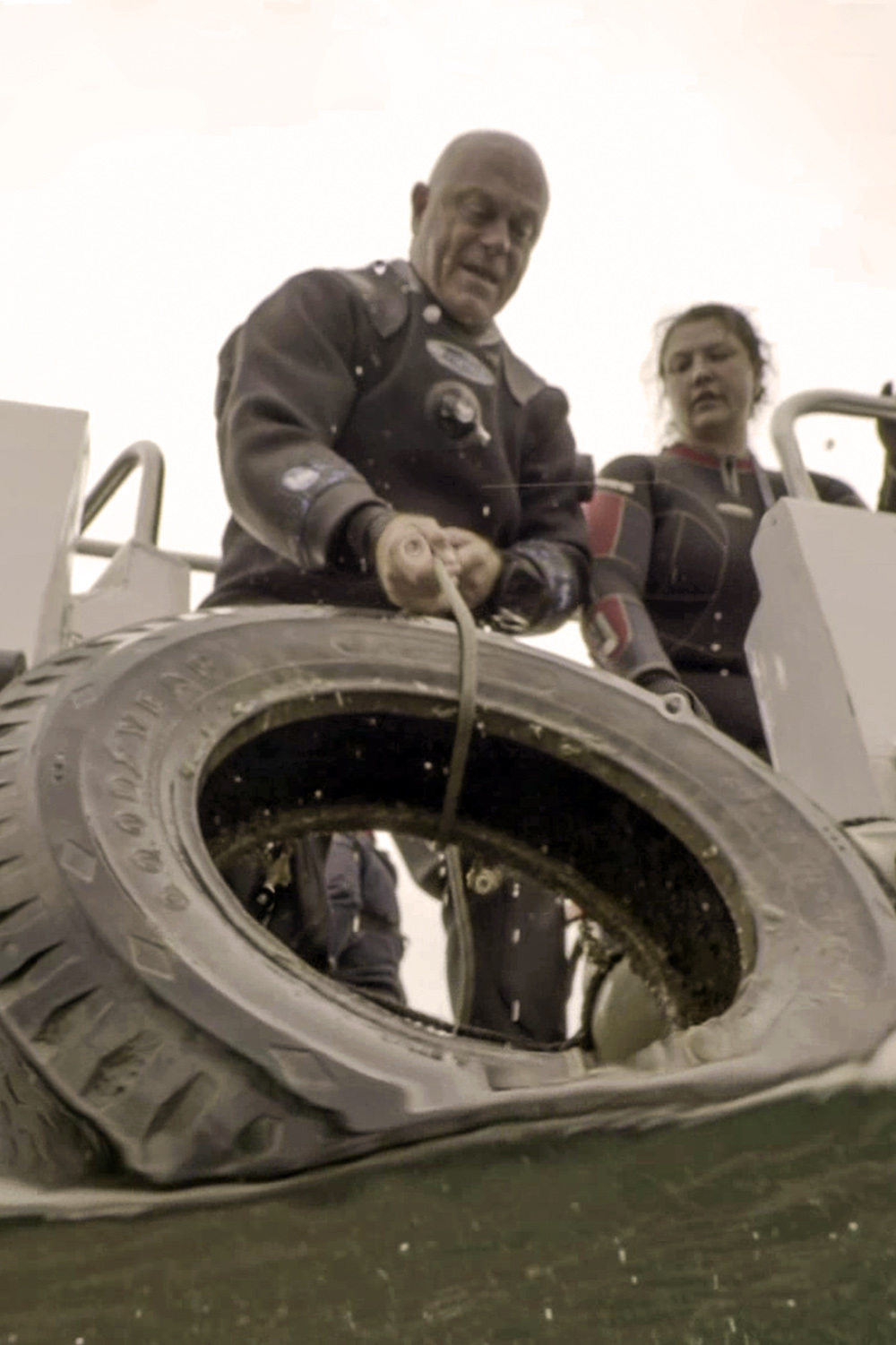 Ross Kemp recovering a tyre for 1000 Tyres Project, Cawsand Bay, August 2021