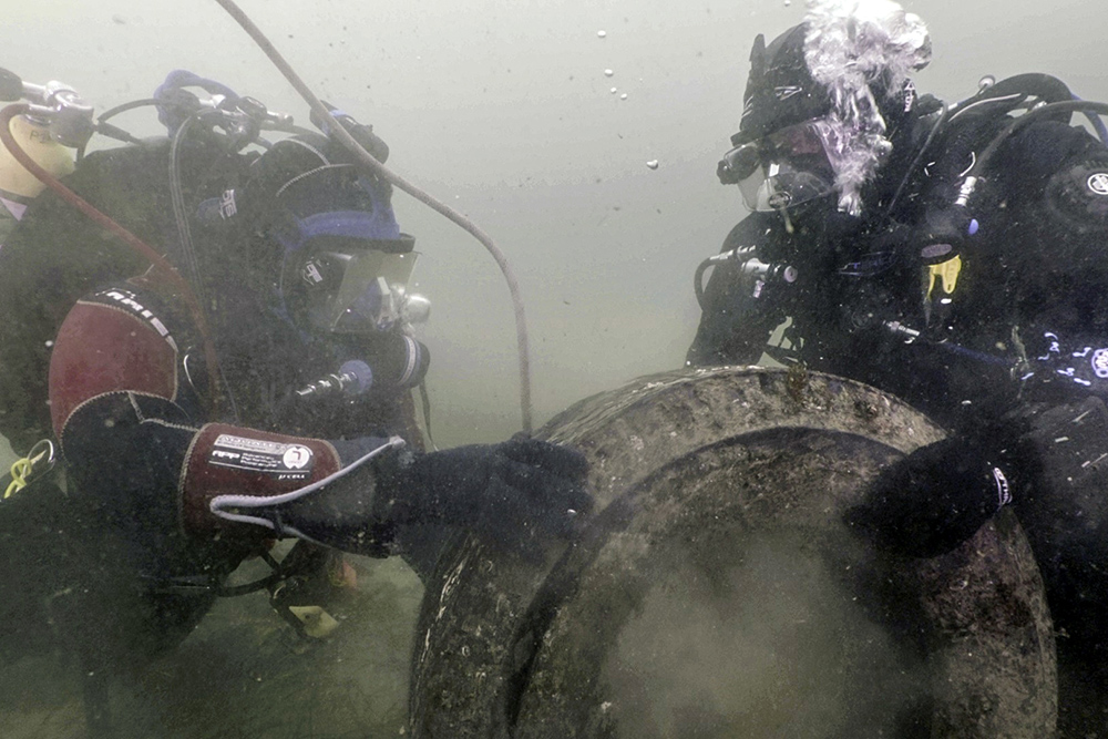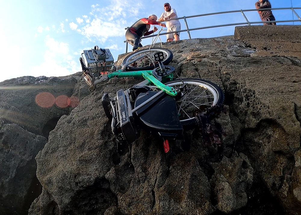 Recovering a Beryl Bike from the sea off the Hoe, Plymouth Sound, August 2024